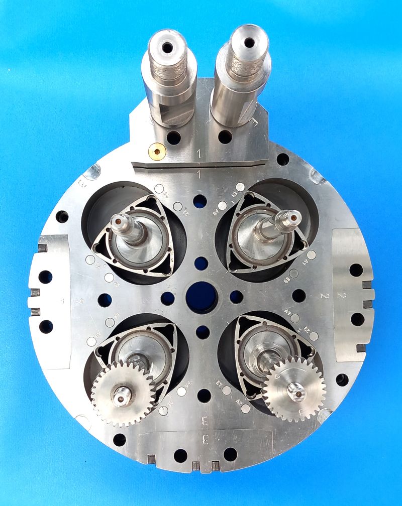 gebraucht. Es sind vier Wankeleinheiten rund um die Antriebsachse nacheinander angeordnet, die durch Erodieren sehr genau